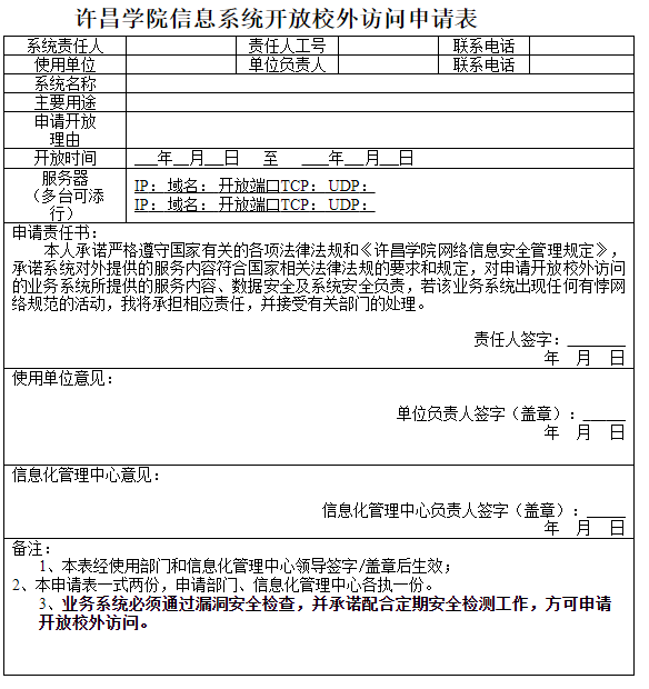 附件一:点击下载 许昌学院信息系统开放校外访问申请表
