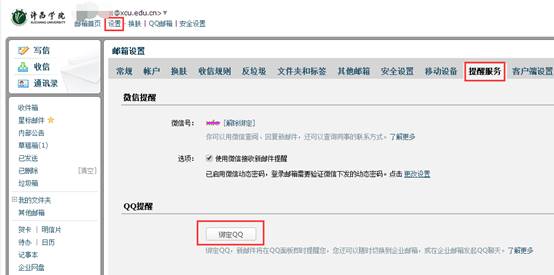 1.成功登录邮箱后,选择“设置”à“提醒服务”,选择“绑定QQ”,如图2所示。