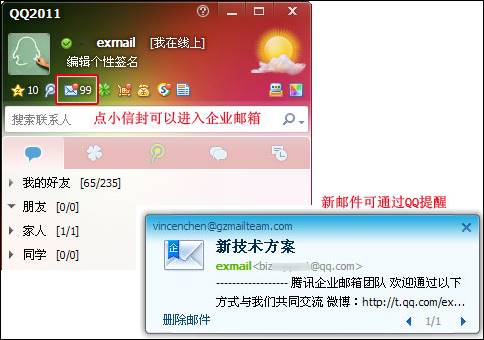 (2)QQ在线时,如果有新邮箱,在屏幕右下角会受到来信提醒。